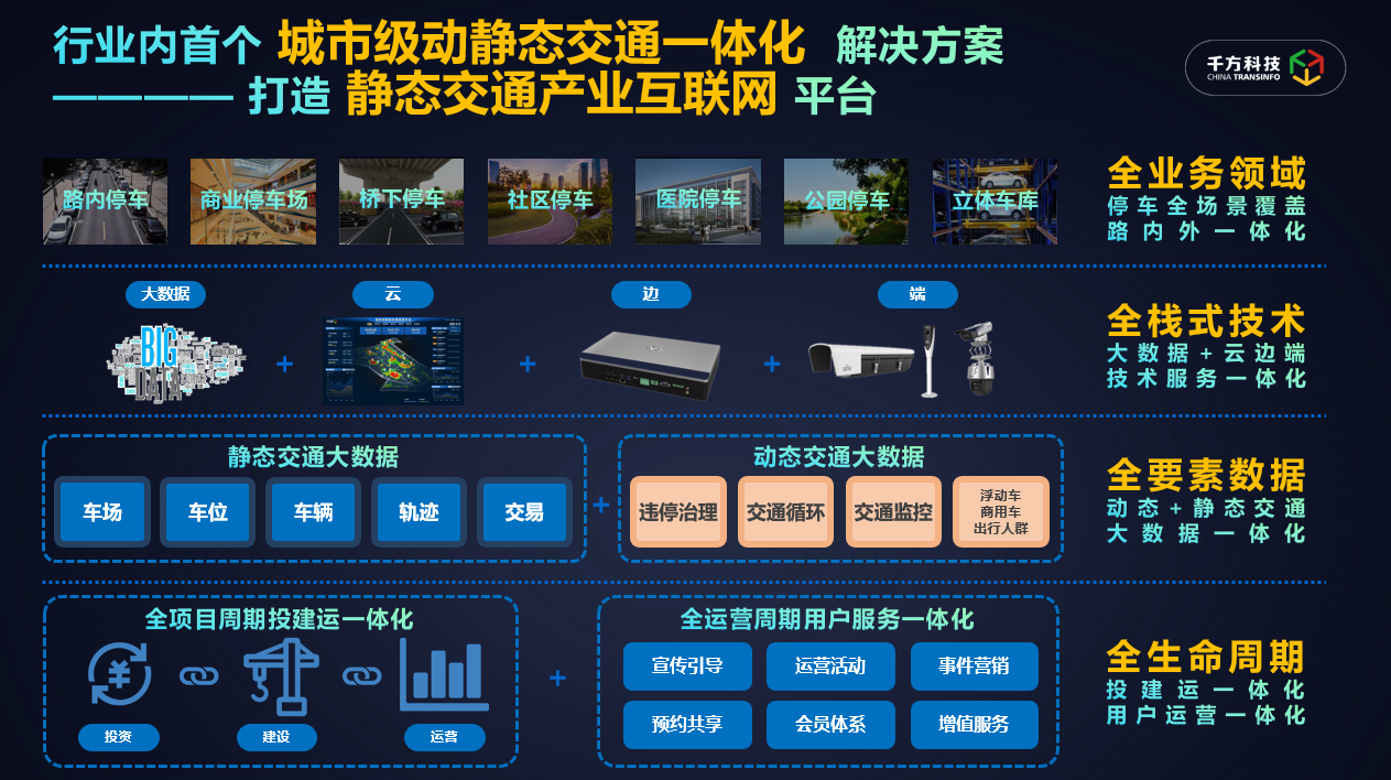 本次大会恒峰g22科技还发布了行业首个城市级动静态交通一体化解决方案。该解决方案是恒峰g22科技Omni-T全域交通解决方案 “四全”关键要素的全面落地,可实现路内路外停车场景全覆盖,包含路内停车、商业场所、桥下停车、社区停车、医院停车、公共停车、地下车库等;依托大数据+云边端融合的全栈式技术、动静态一体化的全要素数据,实施投建运一体化、用户运营一体化的全生命周期服务。该方案是业内首次将动态交通数据应用于静态交通综合治理,并通过打造静态交通产业互联网平台实现客户价值倍增。